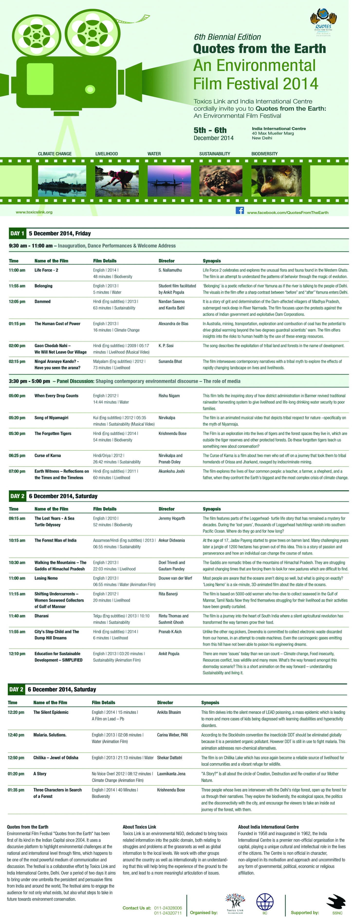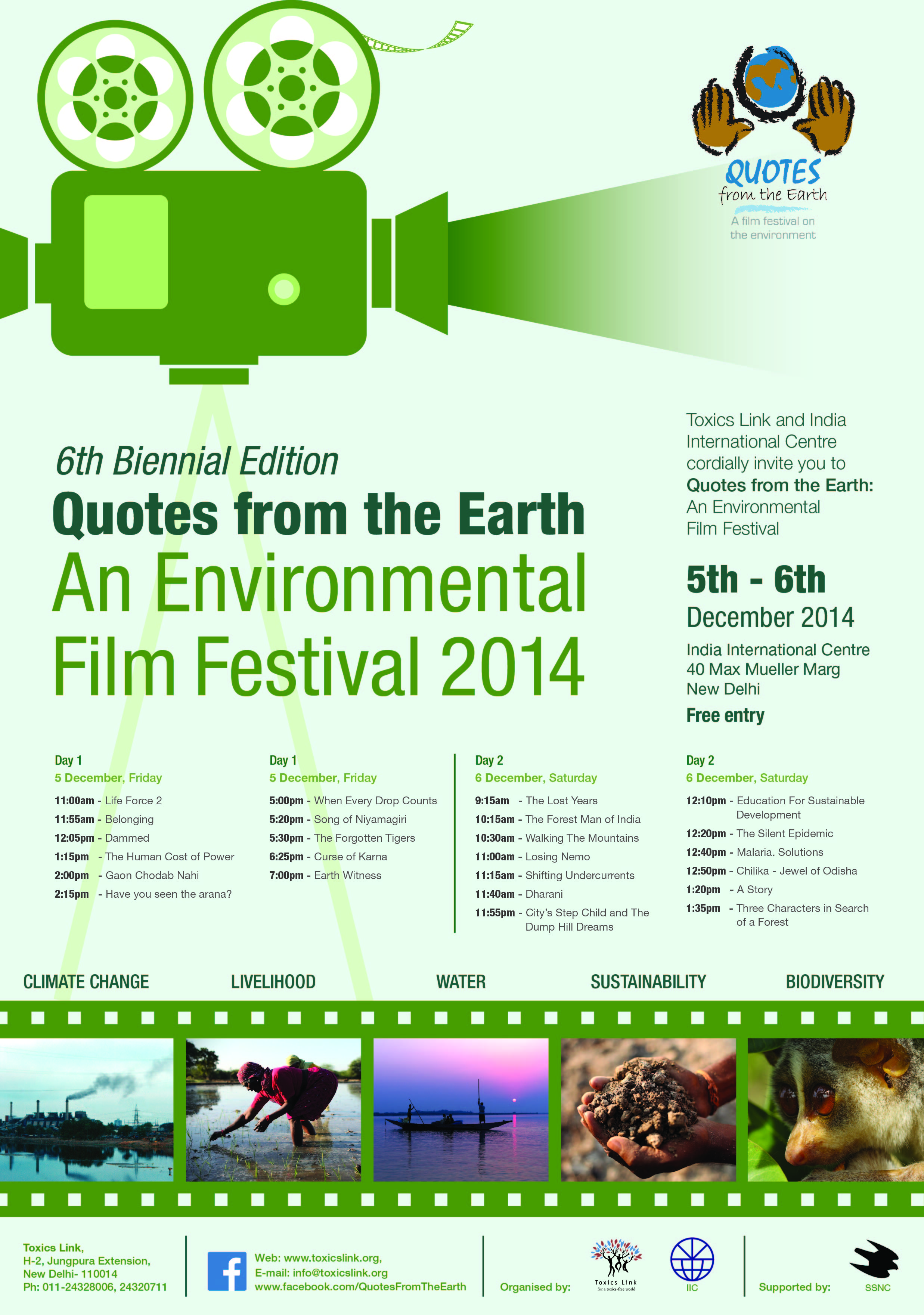 Environmental Film Festival "Quotes from the Earth" has been first of its kind in the Indian Capital since 2004. It uses a discursive platform to highlight environmental challenges at the national and international level through films, which happens to be one of the most powerful medium of communication and discussion. The festival is a collaborative effort by Toxics Link and India International Centre, Delhi. Over a period of two days it aims to bring under one umbrella the persistent and persuasive films from India and around the world, The festival aims to engage the audience for not only what exists, but also what steps to take in future towards environment conservation.