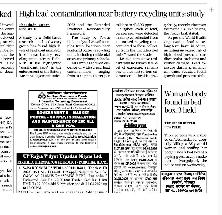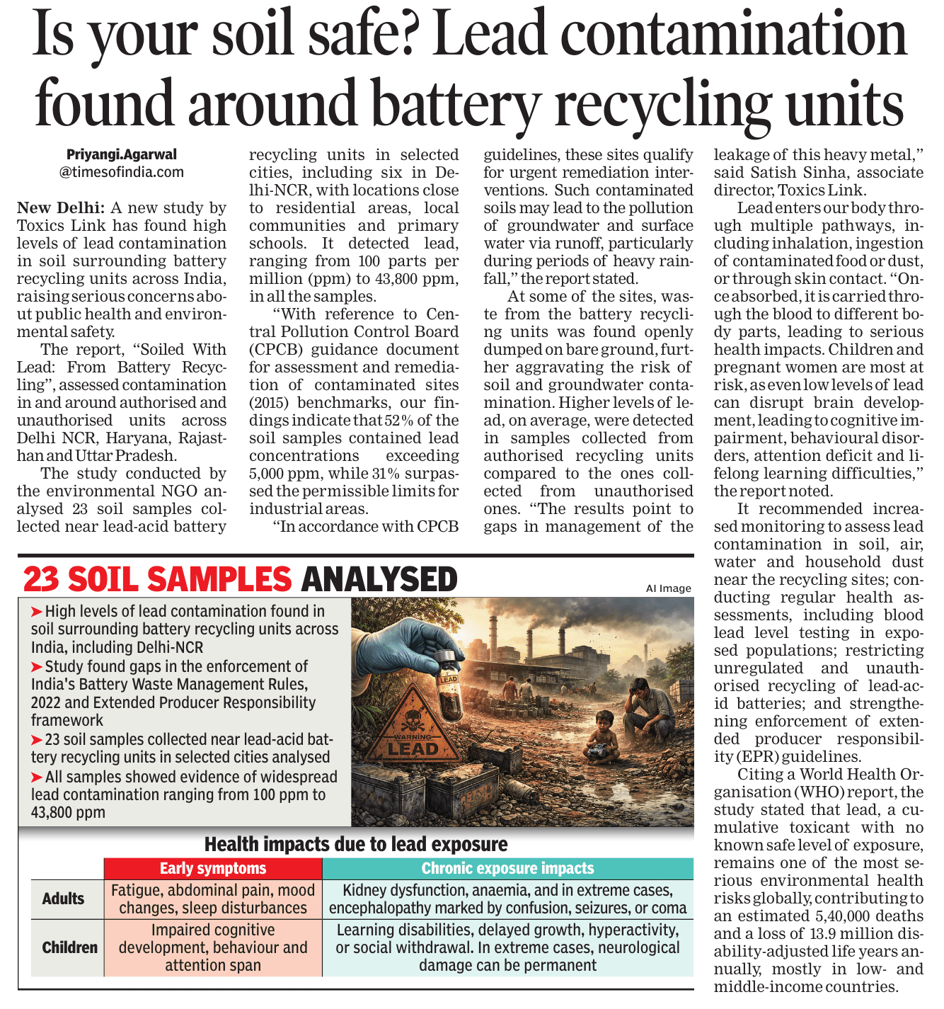 Soil near Delhi-NCR battery recycling sites have high levels of lead, finds Toxics Link study msn| 9 Apr...